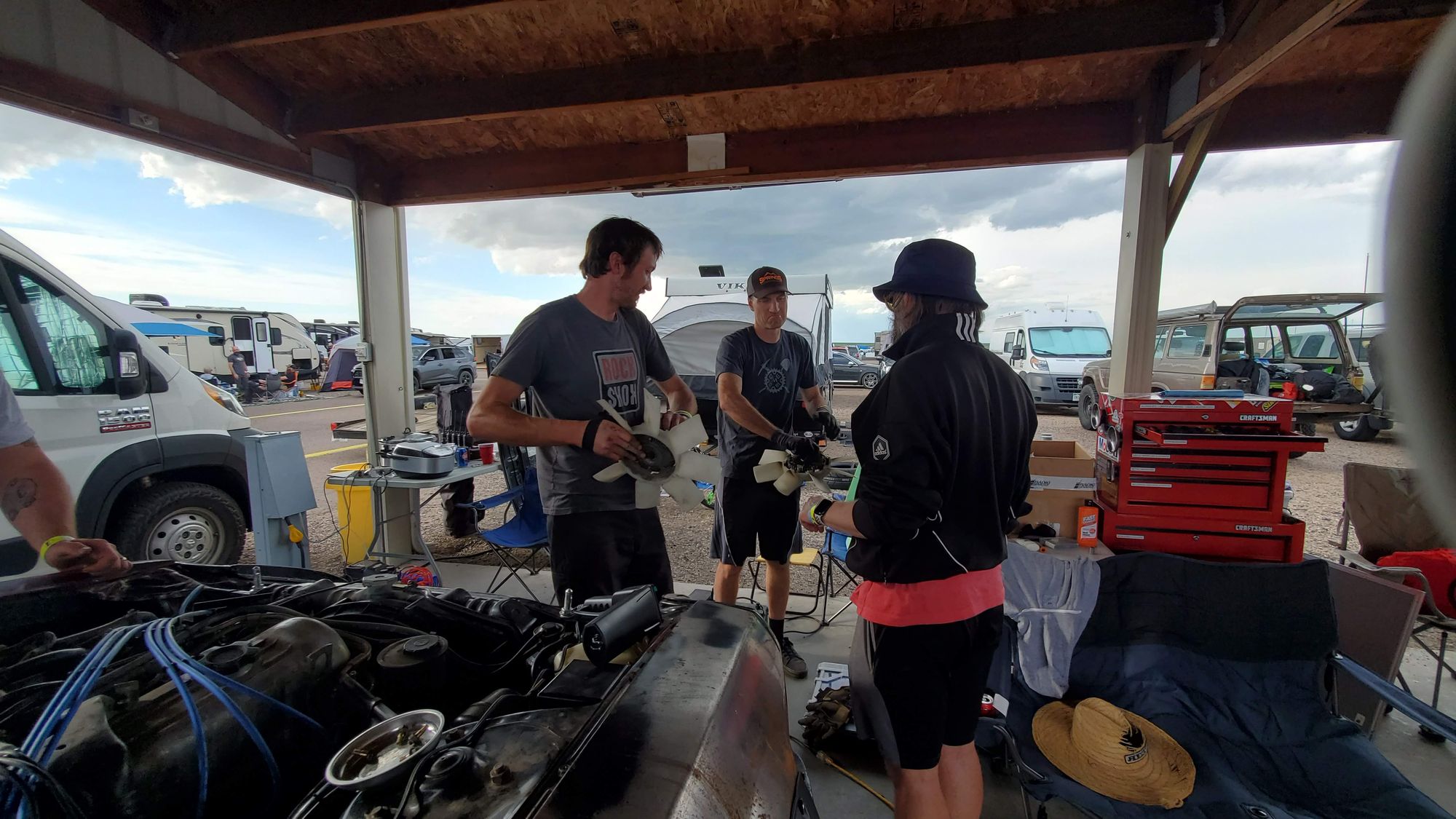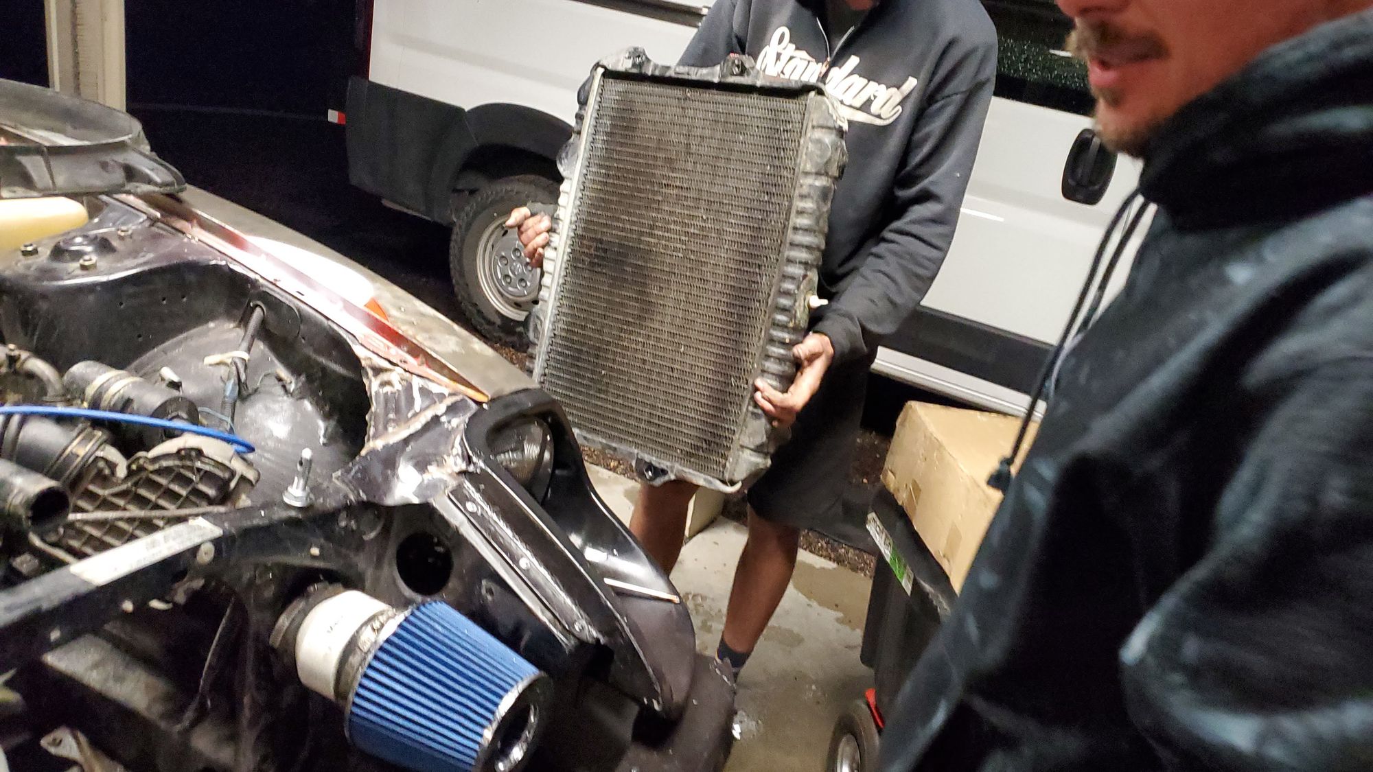 Cleared to race, but with an overheating 42 year old car. We did some searching online, and there did not appear to be a radiator within 1000 miles of Denver. Did I mention the Spirit of Lemons is Helping? Did I mention those nice guys from Bakit Racing racing who knew a lot about Datsuns? In addition to consultation and knowledge transfer, these guys happened to have a spare radiator for a 40 year old Datsun, and! they were willing to let us use it for the race!