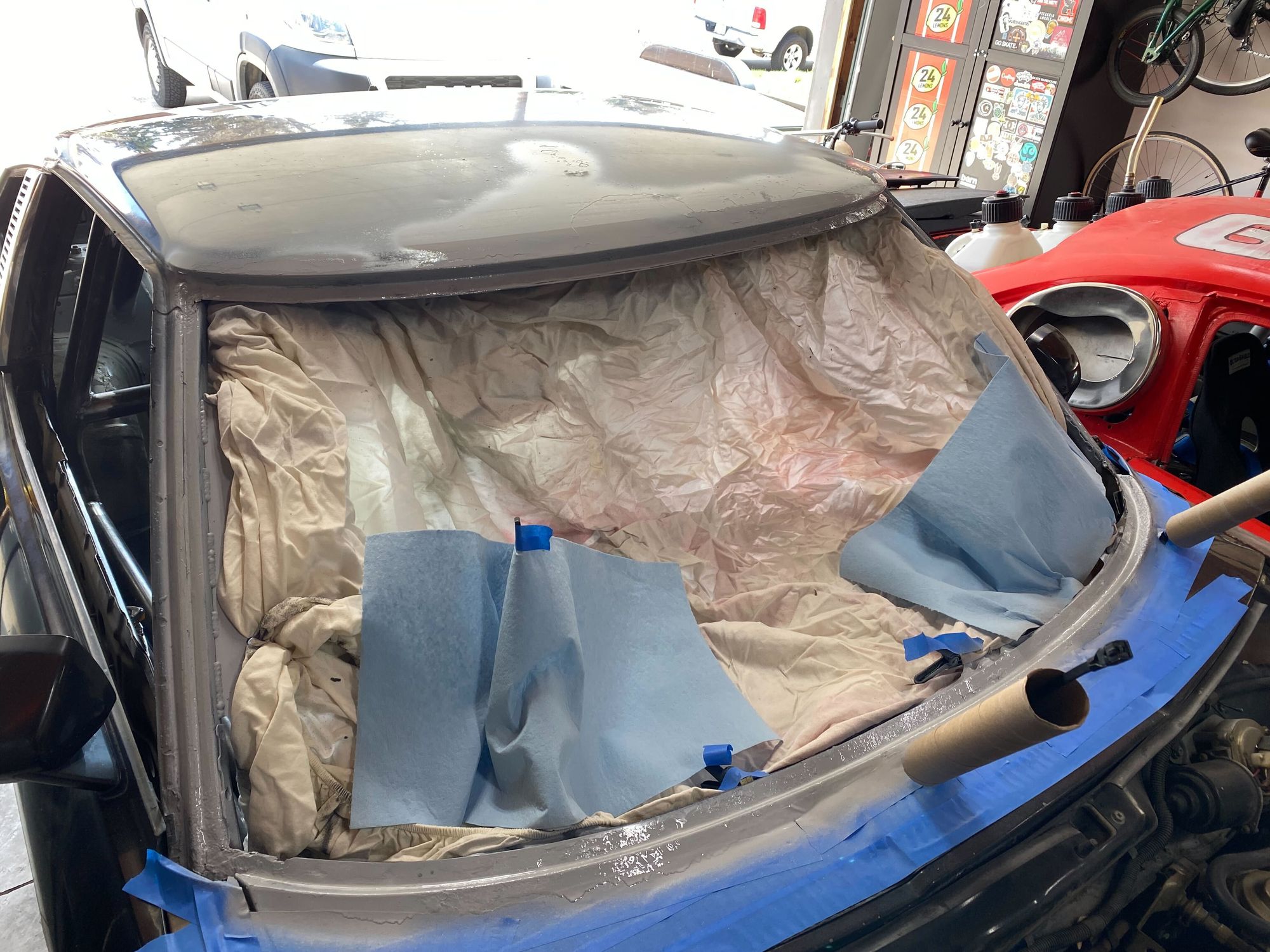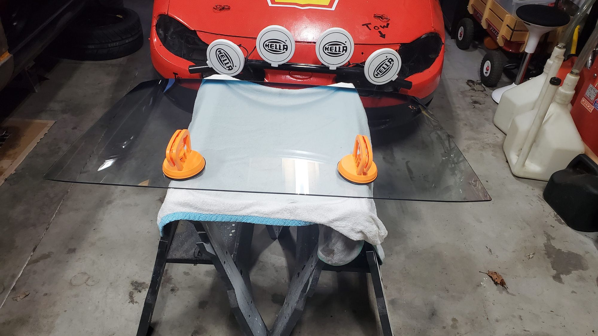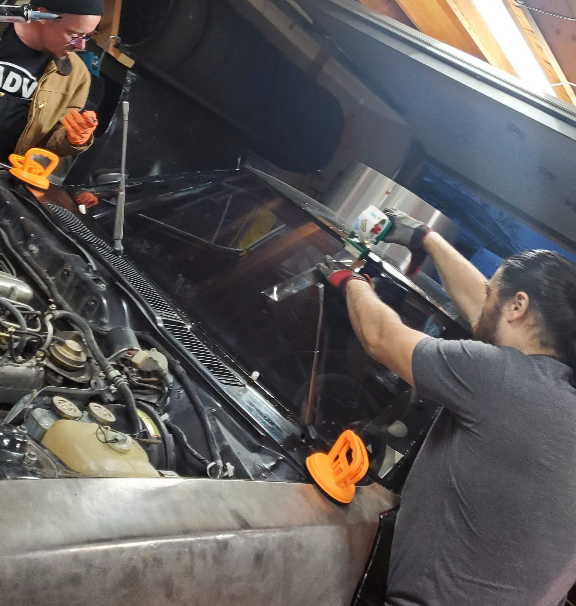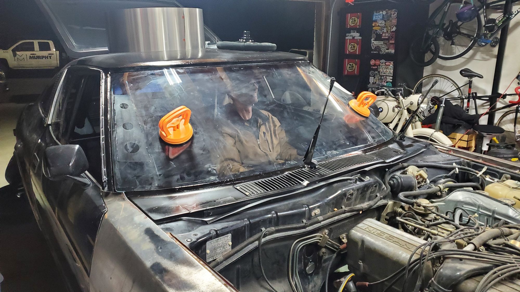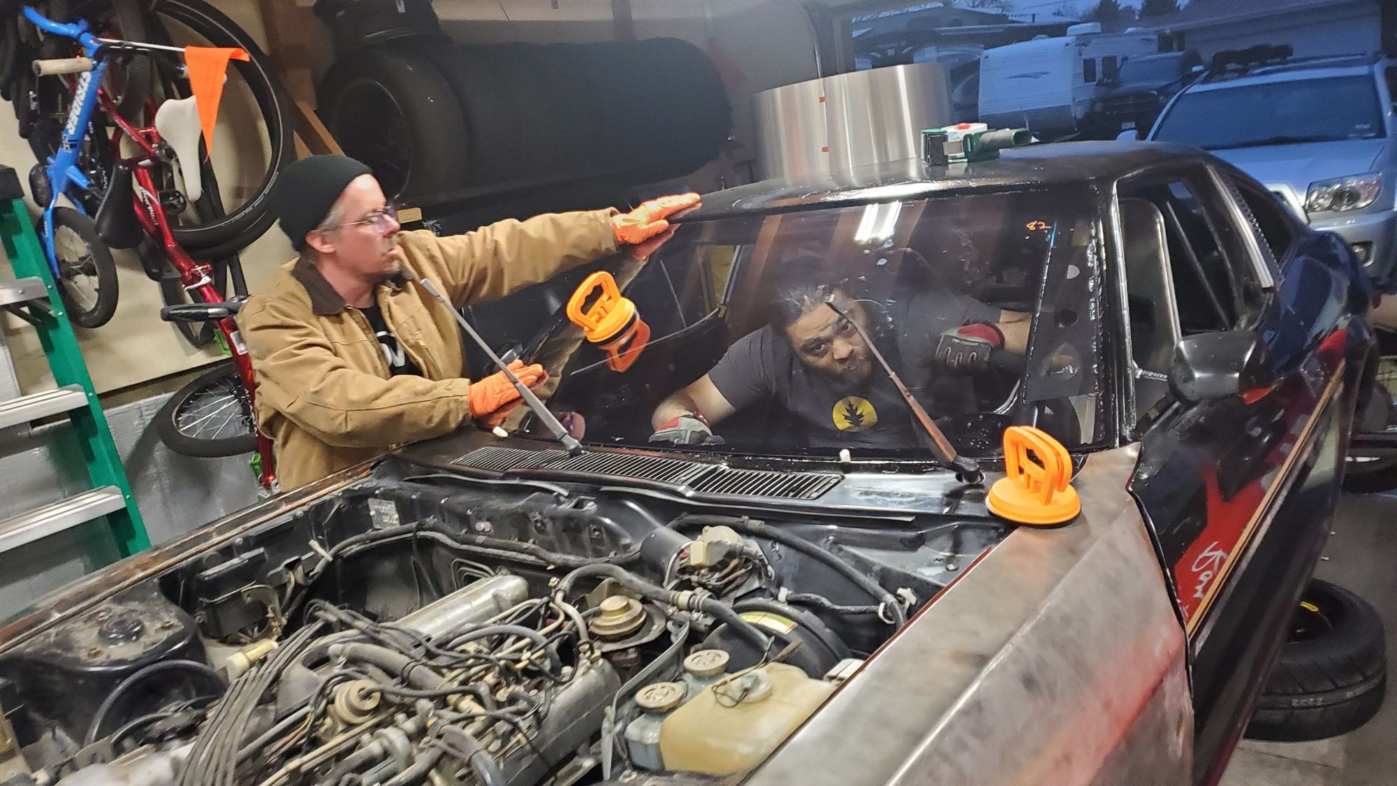 We cleaned up the windshield, and scheduled a mini-session with fewer people for the actual install. Lots of people + moving glass = poor life choice, even for a Lemons team.