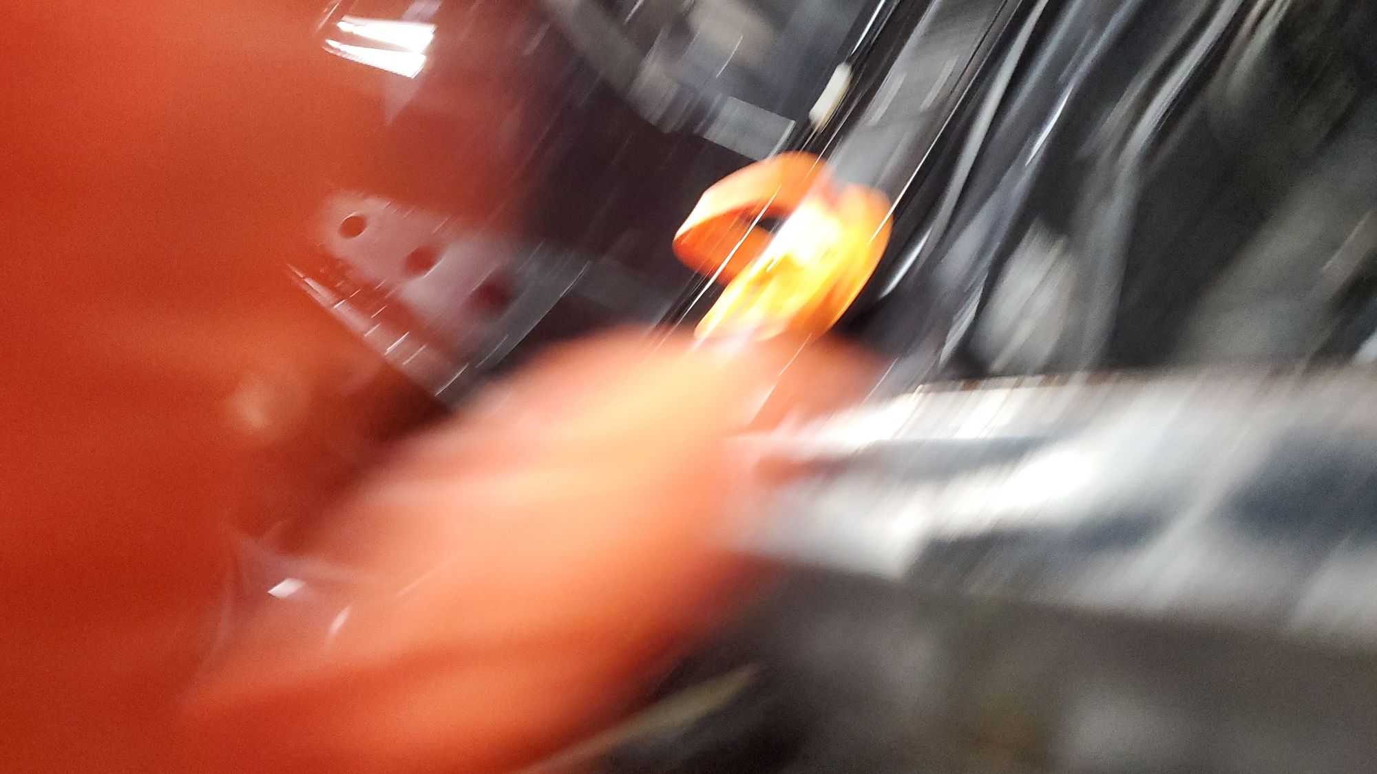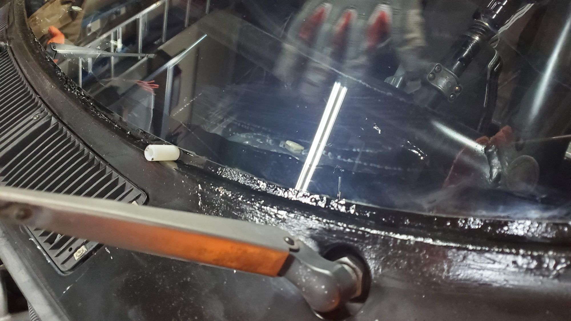 We put down a primer, and then a healthy bead of glass adhesive. Once that stuff is on, it's go time. You have ~15 minutes before it starts to harden up. In lieu of a photo of the actual moment of install, please instead enjoy this blurry mess. It does a good job of capturing the anxiety as the three of us moved the windshield into place.