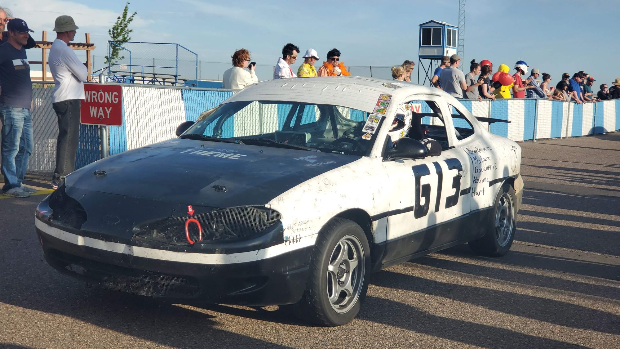 We lost a transponder the race before this during an unscheduled wheel separation event. Transponders are expensive. Happily the team walked the field near the track, and found it! We now mount it in the rear wheel well, where even the loss of a wheel should not knock it off.