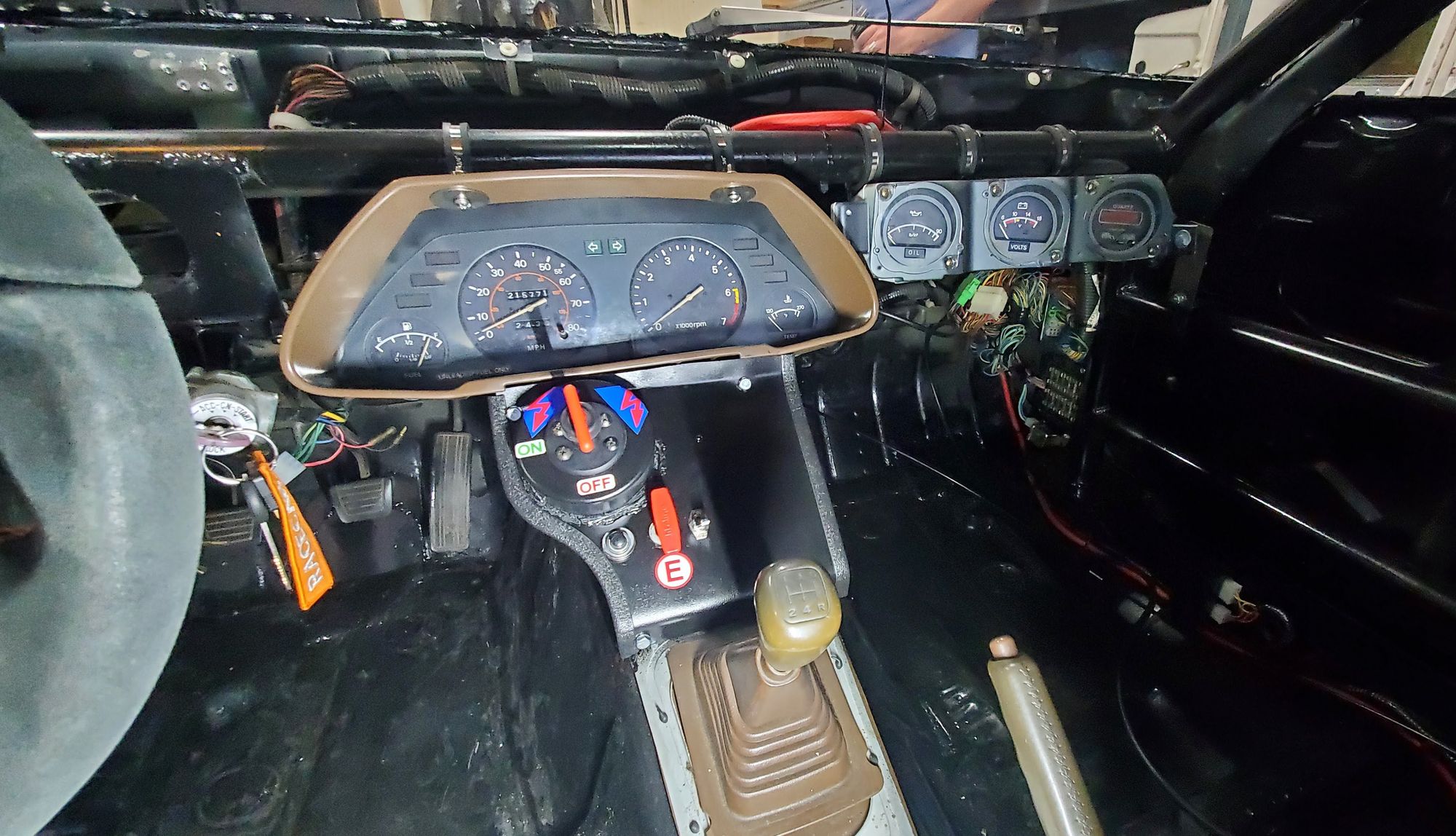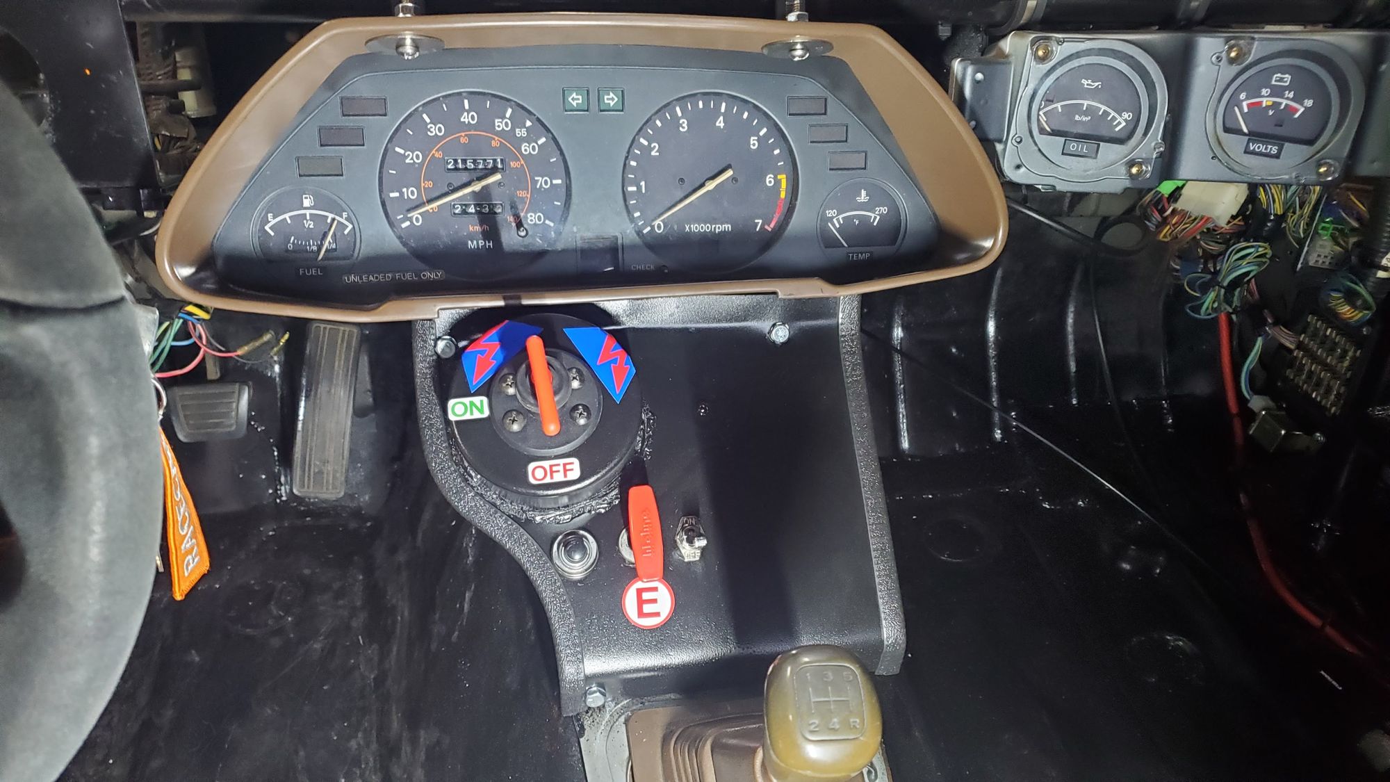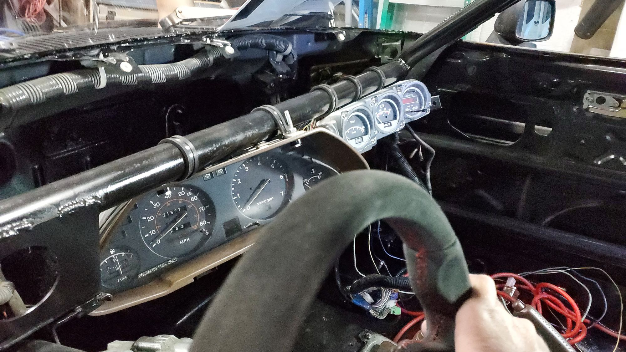 So, this is a bit of a story. Before we talk about the kill-switch, let's talk about that sweet instrument cluster we removed last November. Of course, there is no dash to put it back in, so we had to come up with our own solution. After some tinkering, Nick was able to secure it to both the roll cage, and the driveshaft tunnel. This worked out incredibly well, as we can see all gauges while strapped in despite an unconventionally "low" mounting point.