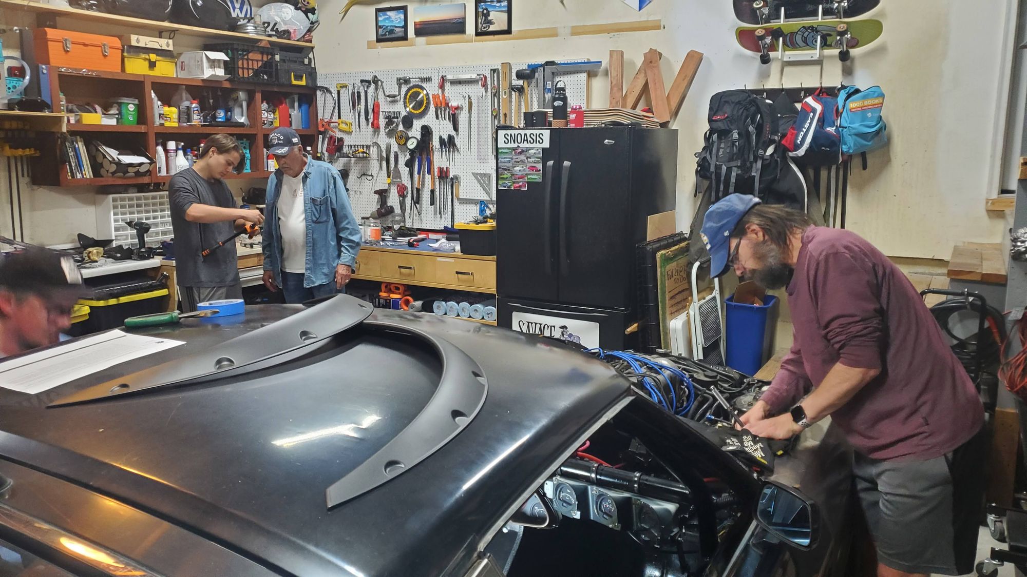 The guys got all 4 pins mounted to the chassis, although it appears our social media team did a poor job of getting even a single, clear shot of one of the pins. You simply can't find good help these days. All that remains of this job is to drill the holes in the hood.