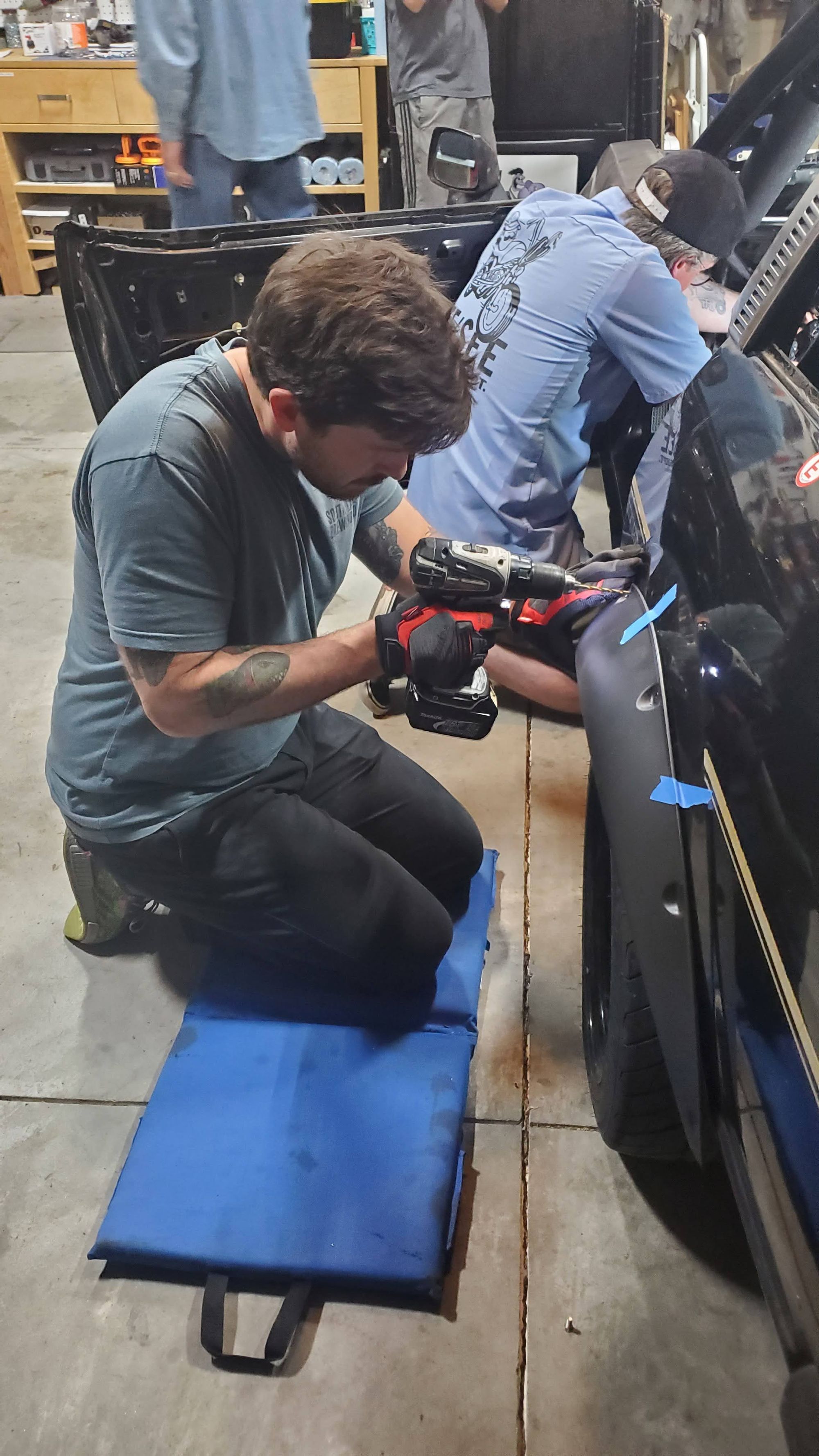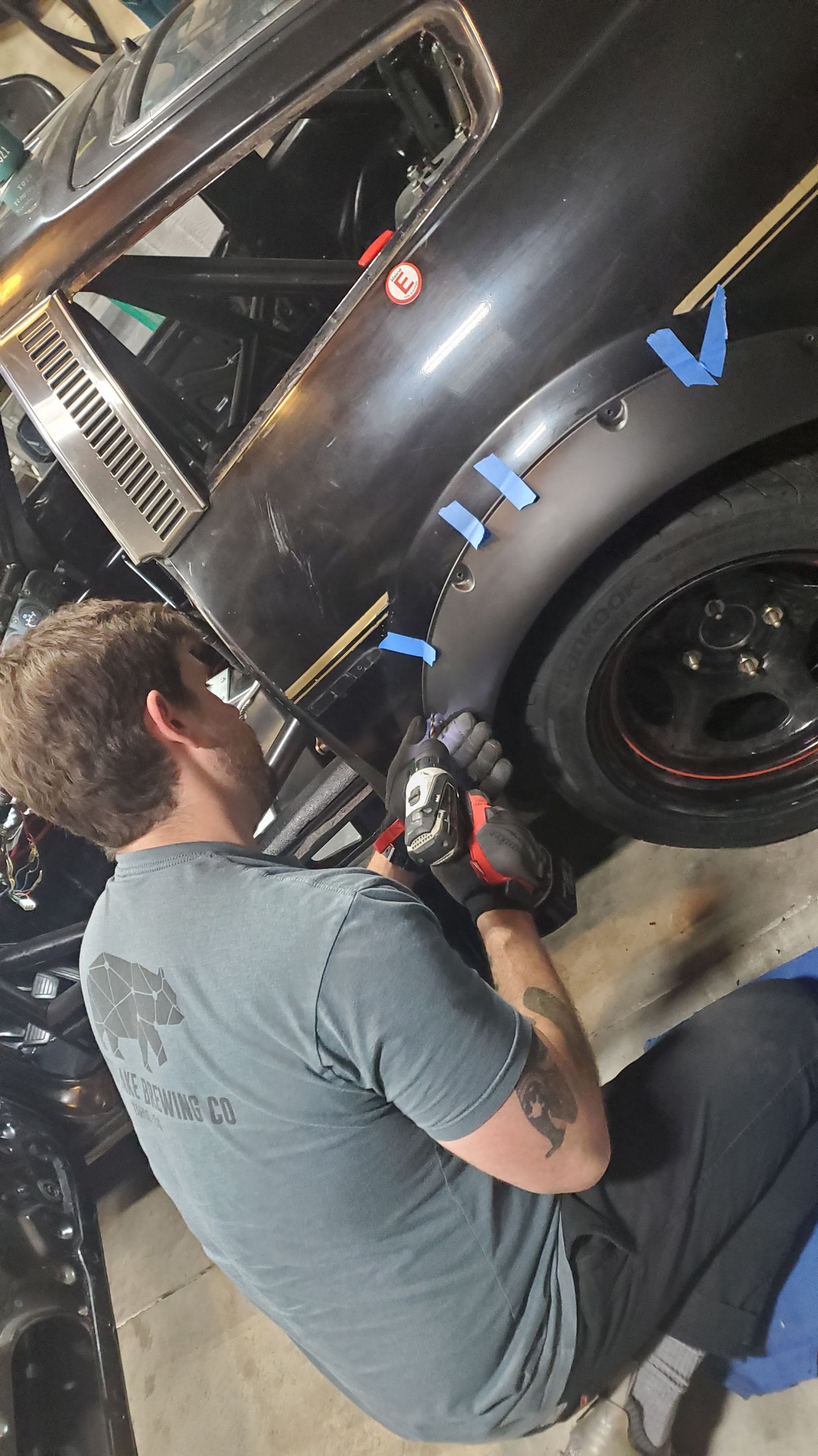 Fender flares, aside from looking dead sexy, ensure our tire surface does not extend past the body. This was Teammate Ben's first time drilling holes in a car, and I think we can all acknowledge what a great moment that is in a persons life. Just sitting there, with a power tool, doing irreparable damage to the body of a vehicle.