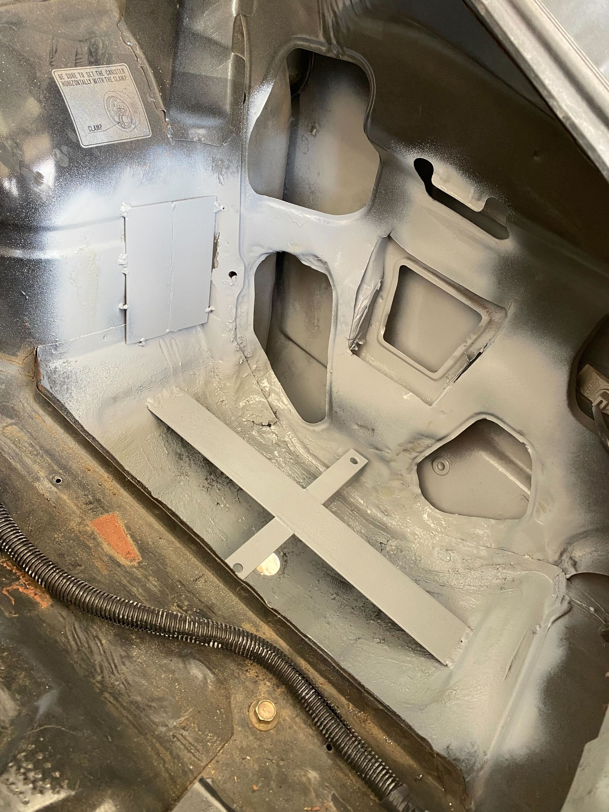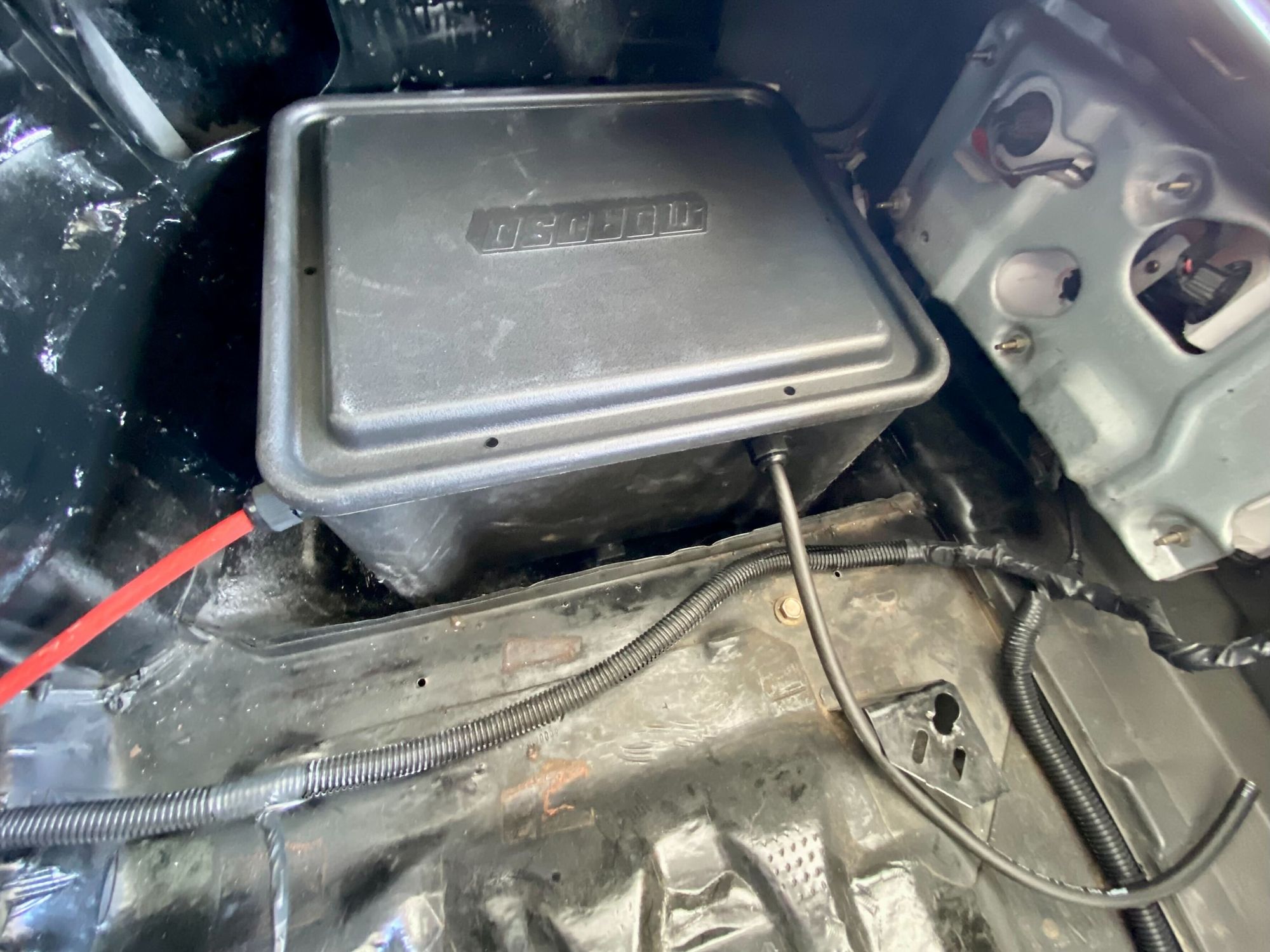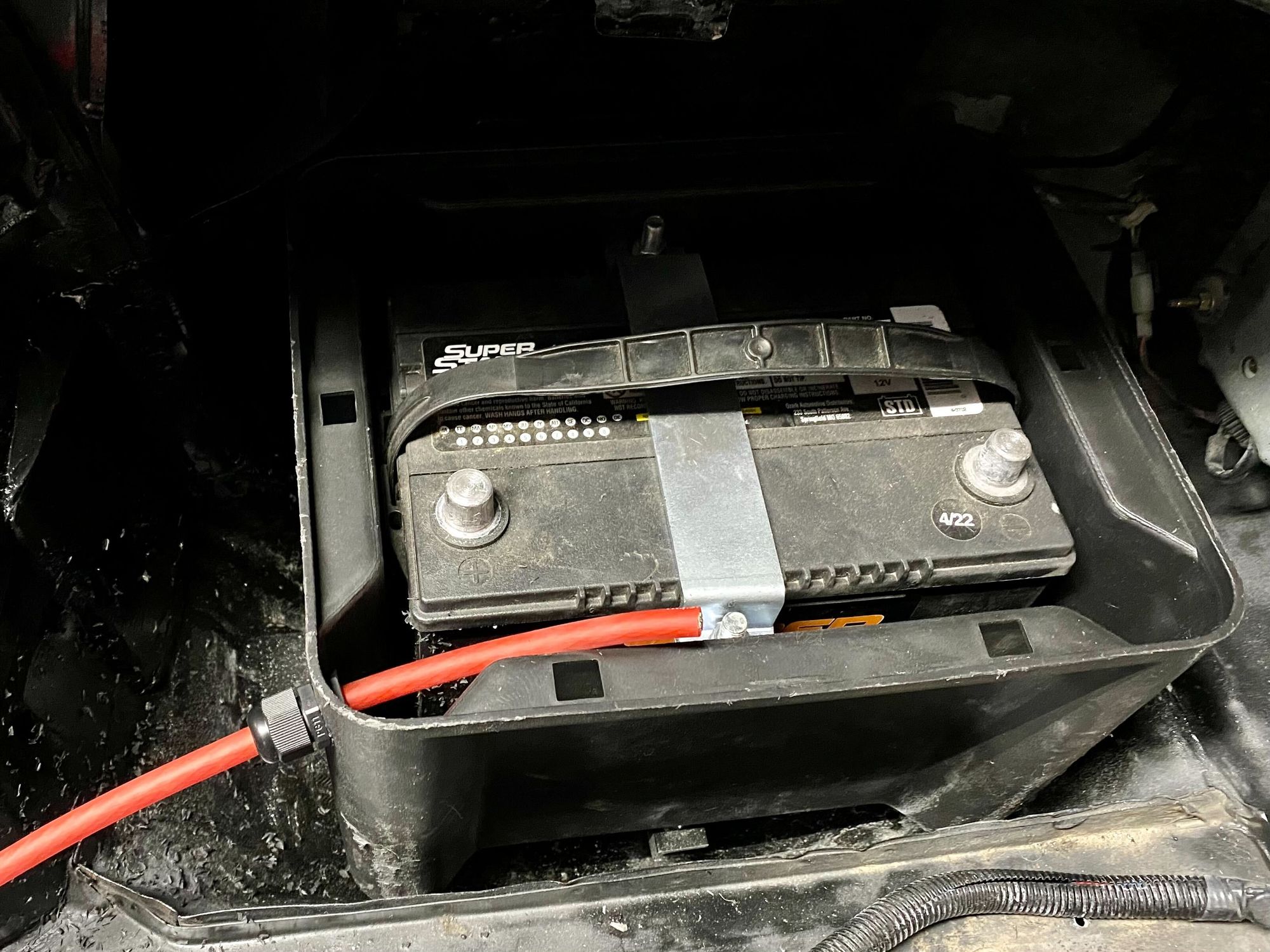 From there, we mounted a battery box, and relocated the cables through the firewall. This is a very good time to mention that the patch above, and the cross brace were both welded by our new teammate, Tyler. Huge shout out to Tyler, not only is he a great guy, but he can weld. None of the rest of us apes can weld, and god damn is it a useful skill in racecar making. Thank you Tyler!