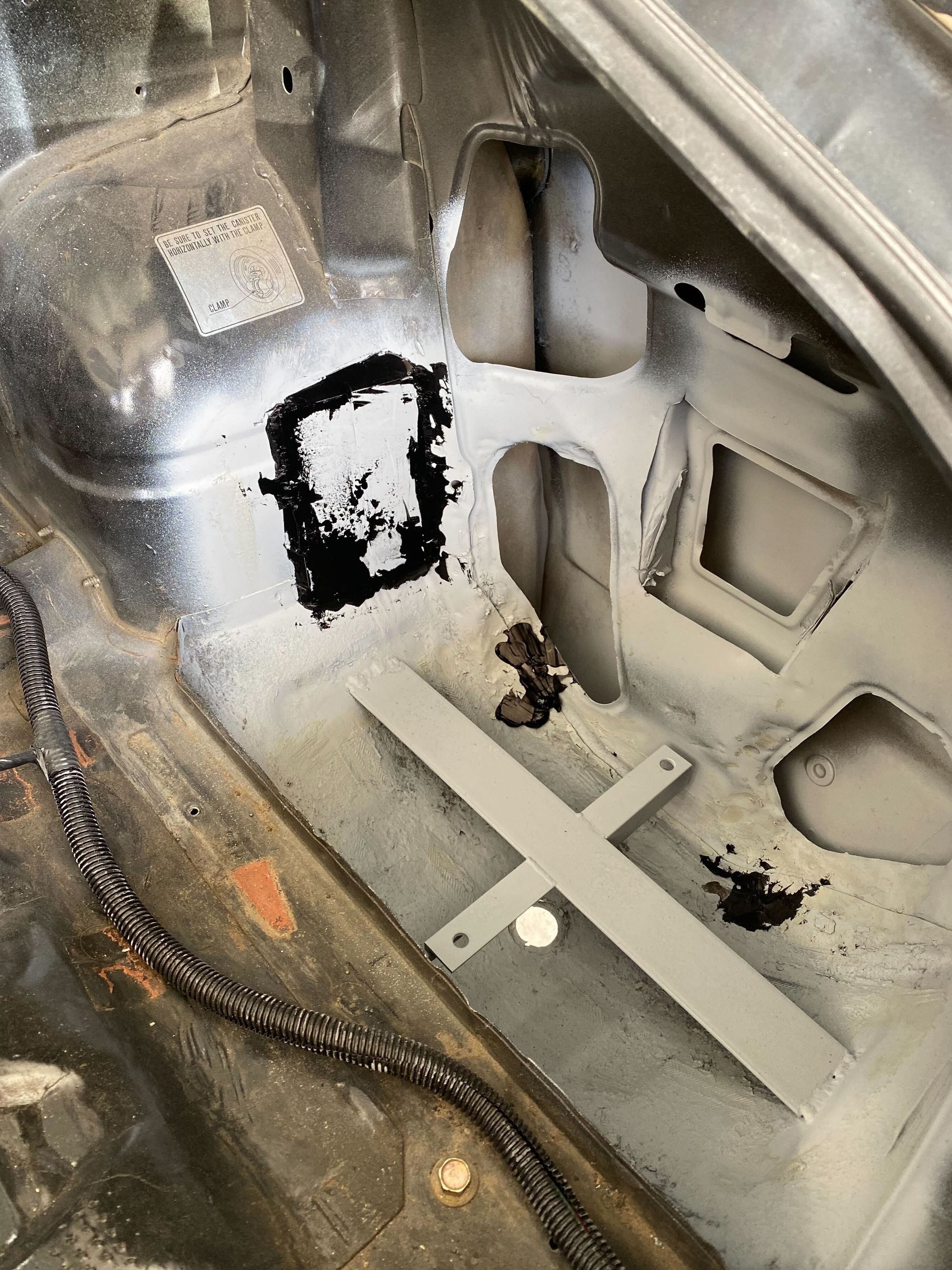 The OEM 1981 Datsun 280ZX spare tire was a hideous little goblin tire that I wouldn't trust on a lawnmower. Happily, the spare storage space behind the rear passenger wheel well makes an almost perfect battery relocation area. We solved the "almost" part with hammers, as you do. That had the unfortunate consequence of rattling some rust out and creating a large new speed hole. That needed to be patched, and we installed a bracket to hold the battery box.